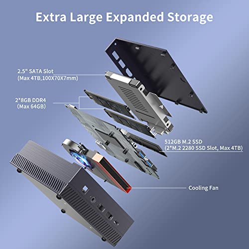 【Mini Body with Large Storage】Available with dual-channel 16GB DDR4 Memory(max 64GB) and 512GB SATA SSD(max 8T), one NVME SSD slot, one M.2 SATA SSD slot and one 2.5″ SATA SSD slot(100*70*7mm), ultra large expandable storage makes this mini computers stand out from other mini pc at the market. Only 5.41 x 4.96 x 1.97 mini body, allows to carry it everywhere or use included VESA mount to hide it on the back of the monitor, lighten up your backpack and free you from the messy desktop.