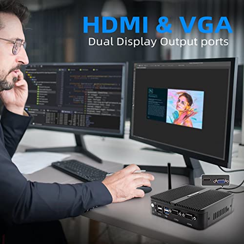 Mini Industrial PC, Windows 10 Pro 8GB DDR4 RAM 256GB SSD, Quad-Core Celeron J4125, 4K HD Mini Desktop Computer, Micro PC, HDMI/VGA/2 RJ45 Gigabit Ethernet/Dual Band Wi-Fi/BT 4.0/2RS232 Com port/VESA