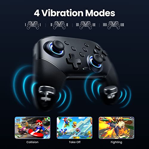 ????【Compatible with Nintendo Switch】Pro controller is perfectly compatible with Nintendo Switch/Lite/OLED/Android/IOS/PC (need a cable), works for all Switch games and multi-device games for up to four players. New updated 800 mAh battery for longer gaming time (about 10-15 hours). Wake-up function: Press the HOME button to wake up the console. 2 Pairing Methods: Y+HOME or One-Key pairing. 10-meters transmission range allows you to play games freely.